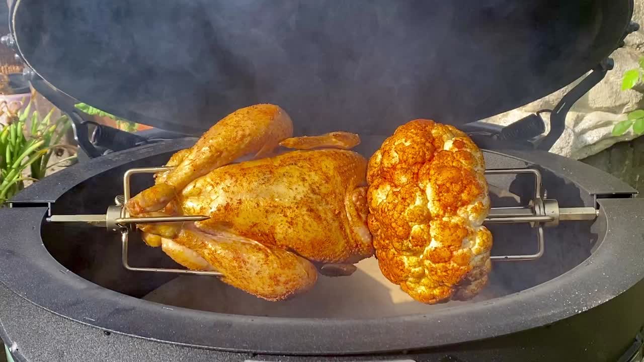 - Gegrilde & gerookte kip van de rotisserie op de Big Green Egg.